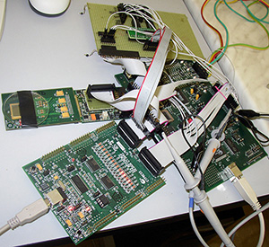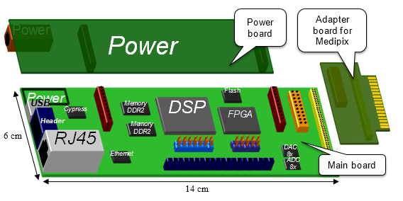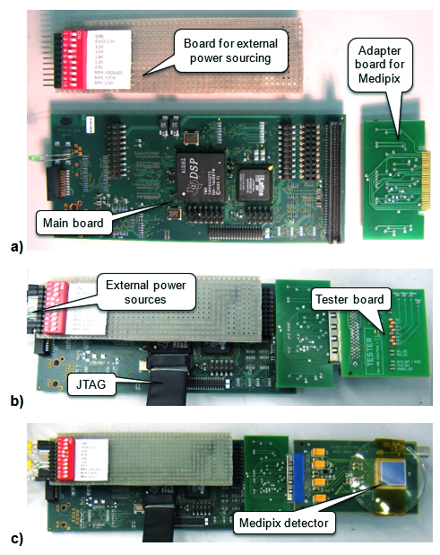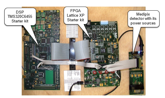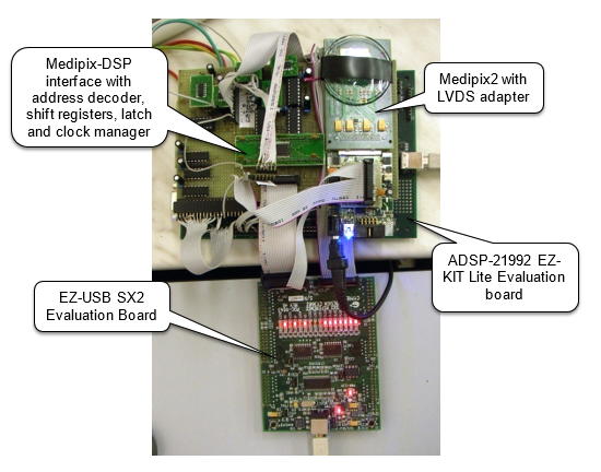 At first, the concept was built with the use of Analog devices ADSP-21992 EZ-KIT Lite evaluation board as DSP, Cypress SX2 evaluation board as USB2.0 interface, and CMOS logic interface between Medipix and DSP for the first prototyping, testing and debugging. Hardware design, programming, testing and proofing of this concept was the subject of my diploma thesis.
