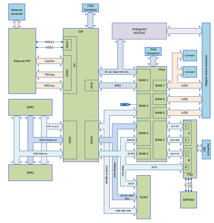 The RUIN is also equipped with eight 16-bit DACs , eight 16-bit ADCs , two JTAG connectors for programming DSP and FPGA, and two general purpose connectors (20 pins and 40 pins) containing SPI , I2C , ADC inputs and DAC outputs.
