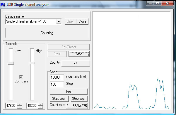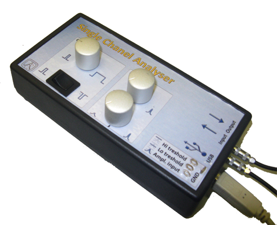 Single channel analyzer for position sensitive activation analysis makes possible coincidence measuring with high sensitive germanium detector and position sensitive Timepix detector. Analyzer allows automatic scan of the element energy spectrum and settings of the low and high threshold for variable Timepix triggering. The device is connected to computer through USB which provides power supply too. Software running under MS Windows allows control the analyzer and process data.
