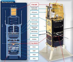 VZLUSAT-1 je takzvaný 2U CubeSat = dvě kostky o straně 10cm, s výklopnými solárními panely a vysunovací rentgenovou optikou typu račí oko.