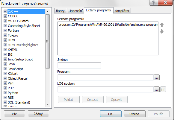 Nastavit Externi programy: